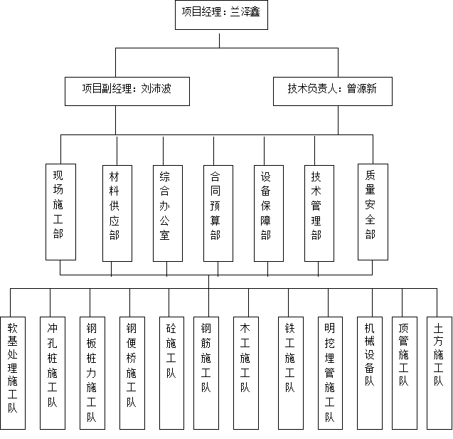 本工程挑选施工经验丰富、责任心强的人员作为施工骨干,采取项目现场组织结构进行施工组织管理,现场管理人员的配备将充分考虑专业结构,具有多年从事市政工程施工管理和技术管理经验,并具有较高的技术水平和管理水平,管理人员对施工程序和控制要素相当熟悉。以项目经理为首、技术负责人为辅,下设施工部、资料结算部、质安部、材料部、技术部等。