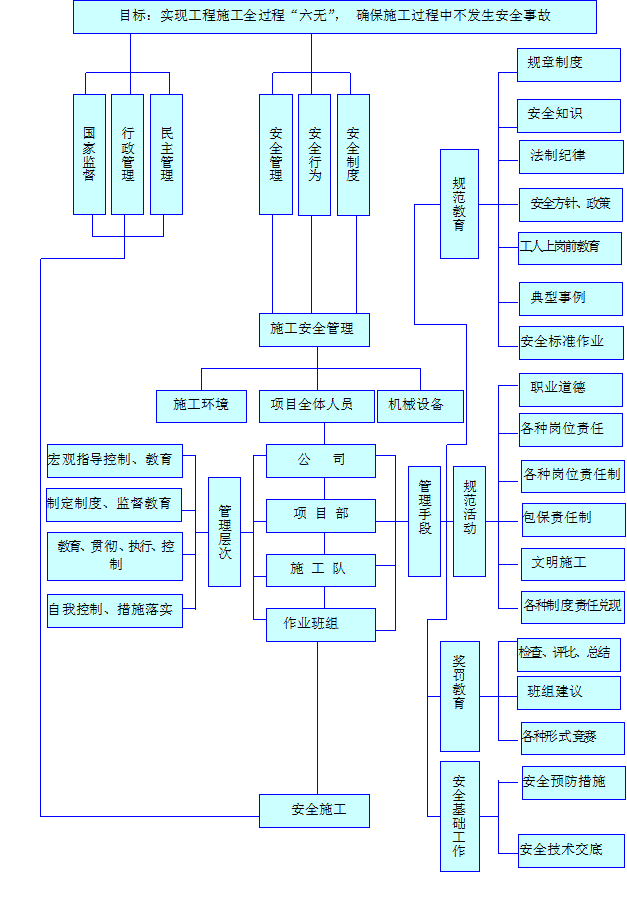 实现工程施工全过程“六无”:即无死亡、无重伤、无倒塌、无中毒、无爆炸、无重大机械交通事故。确保施工过程中不发生安全事故。
