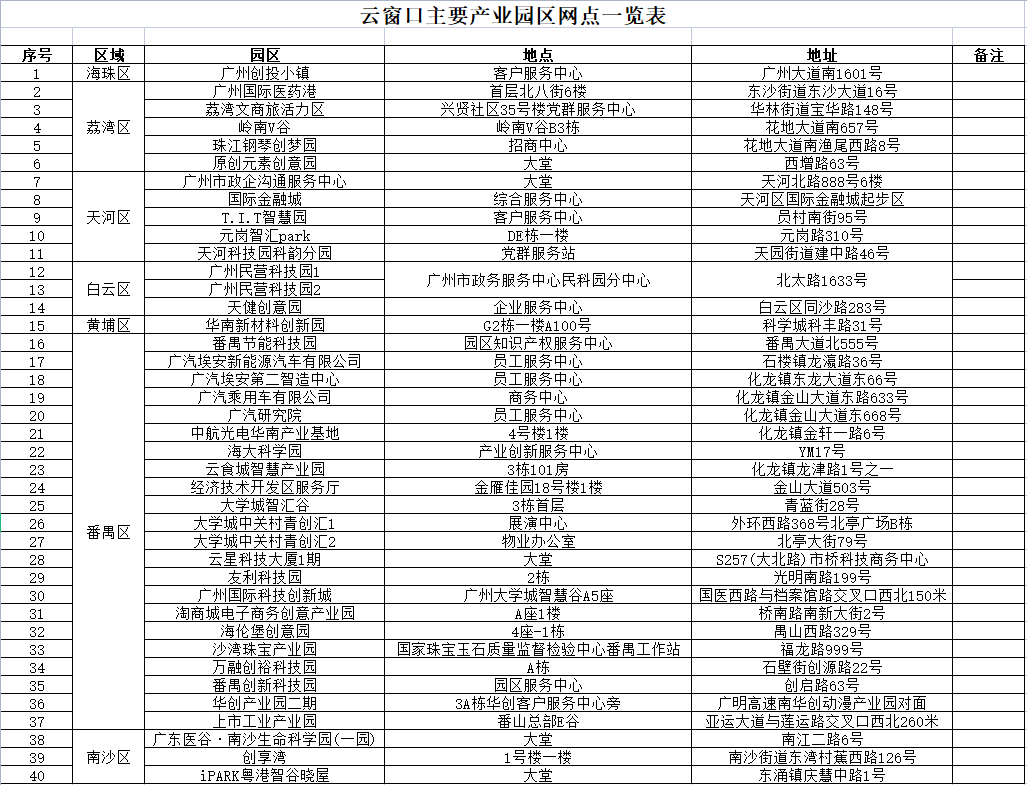 云窗口主要产业园区网点一览表